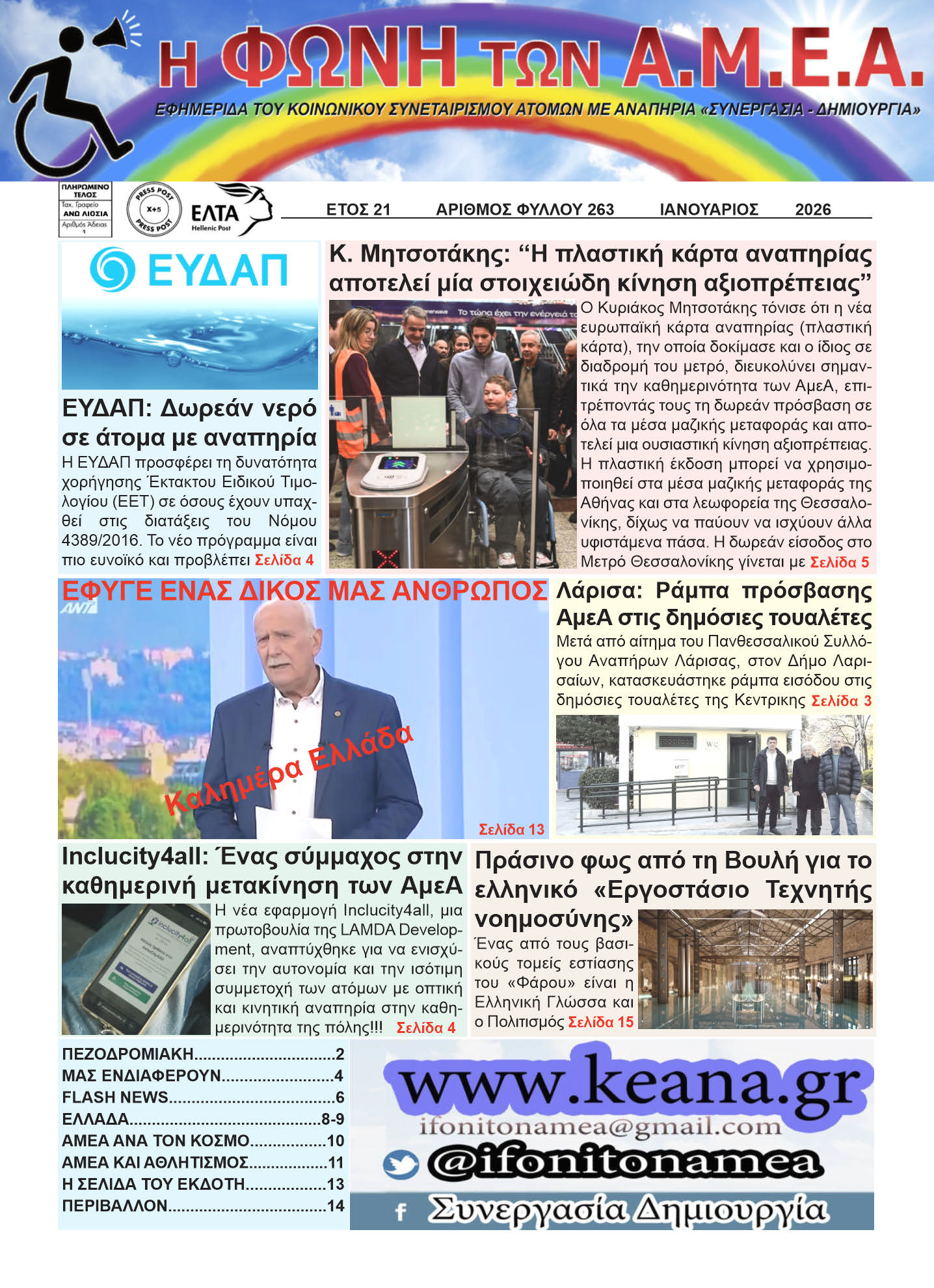 Η ανάγκη να καταστήσουμε ορατή την ύπαρξη της Αναπηρίας στο Ελληνικό κράτος, να ενημερώνουμε για τα προβλήματα που καθημερινά αντιμετωπίζει ο πολίτης – Α.Μ.Ε.Α. και να ακουστεί η δική μας εκδοχή λύσεων και εξομαλύνσεων όλων των αντιξοοτήτων που παρουσιάζονται, ήταν όραμα πολλών ετών. Έτσι, τον Φεβρουάριο του 2004, μια ομάδα ανθρώπων αποφασίσαμε να στήσουμε την μηνιαία εφημερίδα «Η Φωνή Των Α.Μ.Ε.Α.» και να εκδώσουμε το πρώτο μας τεύχος. Η επιτυχία του εντύπου, έφτασε αισίως τα 21 χρόνια κυκλοφορίας και συνεχίζει να εκδίδεται. Διανέμεται σε όλη την Ελλάδα και σε κράτη – μέλη της Ευρωπαϊκής Ένωσης και εκδίδεται σε 10.000 φύλλα. Καθημερινά λαμβάνουμε συγχαρητήριες επιστολές από διάφορους Κρατικούς φορείς, προσκαλούμαστε και συμμετέχουμε επίσημα σε συνεντεύξεις τύπου Υπουργείων, δεχόμαστε αμέτρητα fax από στελέχη της πολιτικής ηγεσίας αλλά και της αντιπολίτευσης και φυσικά συμμετοχή πλήθος κόσμου (Α.Μ.Ε.Α. ή όχι) που θέλει να συμβάλλει σε αυτήν μας την προσπάθεια αλλά και να ενημερωθεί για όσα μας αφορούν.