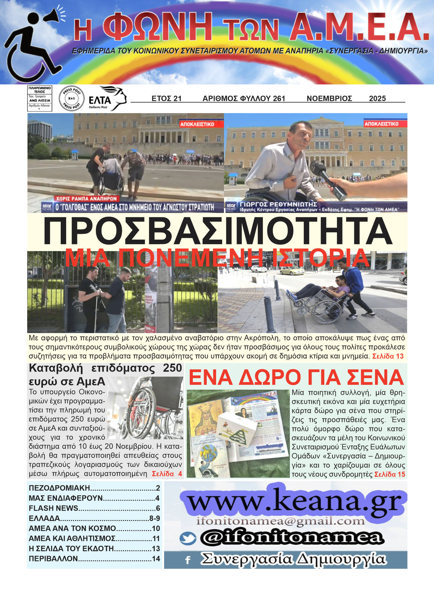 Η ανάγκη να καταστήσουμε ορατή την ύπαρξη της Αναπηρίας στο Ελληνικό κράτος, να ενημερώνουμε για τα προβλήματα που καθημερινά αντιμετωπίζει ο πολίτης – Α.Μ.Ε.Α. και να ακουστεί η δική μας εκδοχή λύσεων και εξομαλύνσεων όλων των αντιξοοτήτων που παρουσιάζονται, ήταν όραμα πολλών ετών. Έτσι, τον Φεβρουάριο του 2004, μια ομάδα ανθρώπων αποφασίσαμε να στήσουμε την μηνιαία εφημερίδα «Η Φωνή Των Α.Μ.Ε.Α.» και να εκδώσουμε το πρώτο μας τεύχος. Η επιτυχία του εντύπου, έφτασε αισίως τα 21 χρόνια κυκλοφορίας και συνεχίζει να εκδίδεται. Διανέμεται σε όλη την Ελλάδα και σε κράτη – μέλη της Ευρωπαϊκής Ένωσης και εκδίδεται σε 10.000 φύλλα. Καθημερινά λαμβάνουμε συγχαρητήριες επιστολές από διάφορους Κρατικούς φορείς, προσκαλούμαστε και συμμετέχουμε επίσημα σε συνεντεύξεις τύπου Υπουργείων, δεχόμαστε αμέτρητα fax από στελέχη της πολιτικής ηγεσίας αλλά και της αντιπολίτευσης και φυσικά συμμετοχή πλήθος κόσμου (Α.Μ.Ε.Α. ή όχι) που θέλει να συμβάλλει σε αυτήν μας την προσπάθεια αλλά και να ενημερωθεί για όσα μας αφορούν.